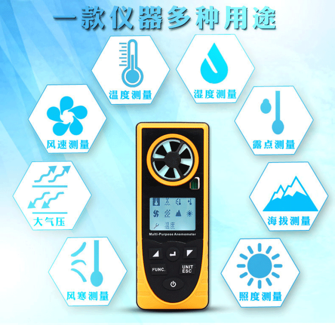 本產品是一款本便攜式多功能氣象儀,適用于測量溫度、濕度、風寒、露點、風速、大氣壓、海拔、照度。