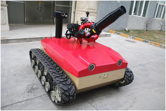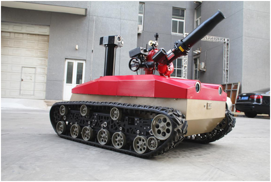 防爆消防滅火偵察機(jī)器人采用耐高溫履帶避震式底盤設(shè)計(jì),能夠適應(yīng)救援環(huán)境中各種復(fù)雜地面。裝配環(huán)境檢測裝置,在滅火的同時(shí)對現(xiàn)場環(huán)境數(shù)據(jù)進(jìn)行偵測。機(jī)器人由機(jī)器人主體,消防炮,環(huán)境檢測裝置,遙控箱四部分組成。主要作用是代替消防隊(duì)員進(jìn)入易燃易爆、有毒、缺氧、濃煙等危險(xiǎn)災(zāi)害事故現(xiàn)場實(shí)施有效的滅火救援、化學(xué)檢測和火場偵察。