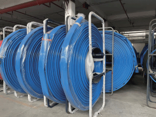 礦用高壓排水軟管采用一次性共擠成型工藝,由TPU內(nèi)襯、編織層和TPU覆蓋層組成。TPU覆蓋層阻燃、抗靜電;編織層內(nèi)含有抗靜電導(dǎo)線,TPU內(nèi)襯可通過水、泡沫液、含油或弱酸堿性等液態(tài)介質(zhì)。這種結(jié)構(gòu)使得軟管重量輕、承壓高、質(zhì)地柔軟、可卷盤、操作方便、鋪設(shè)及撤收機(jī)動(dòng)靈活。
